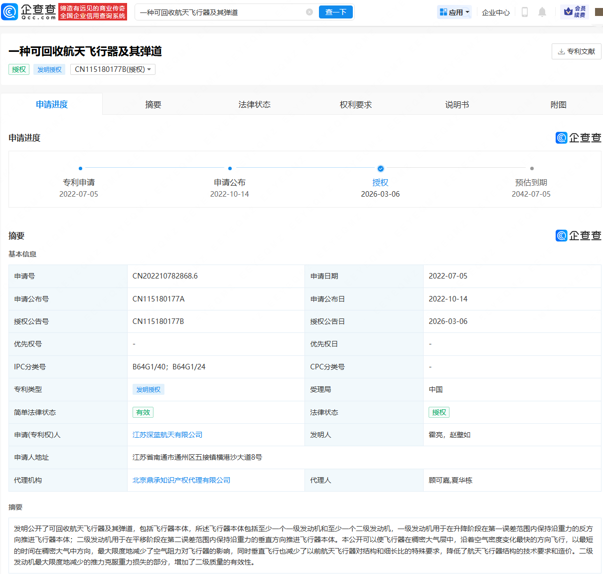 企查查APP显示,近日,江苏深蓝航天有限公司申请的“一种可回收航天飞行器及其弹道”专利获授权。