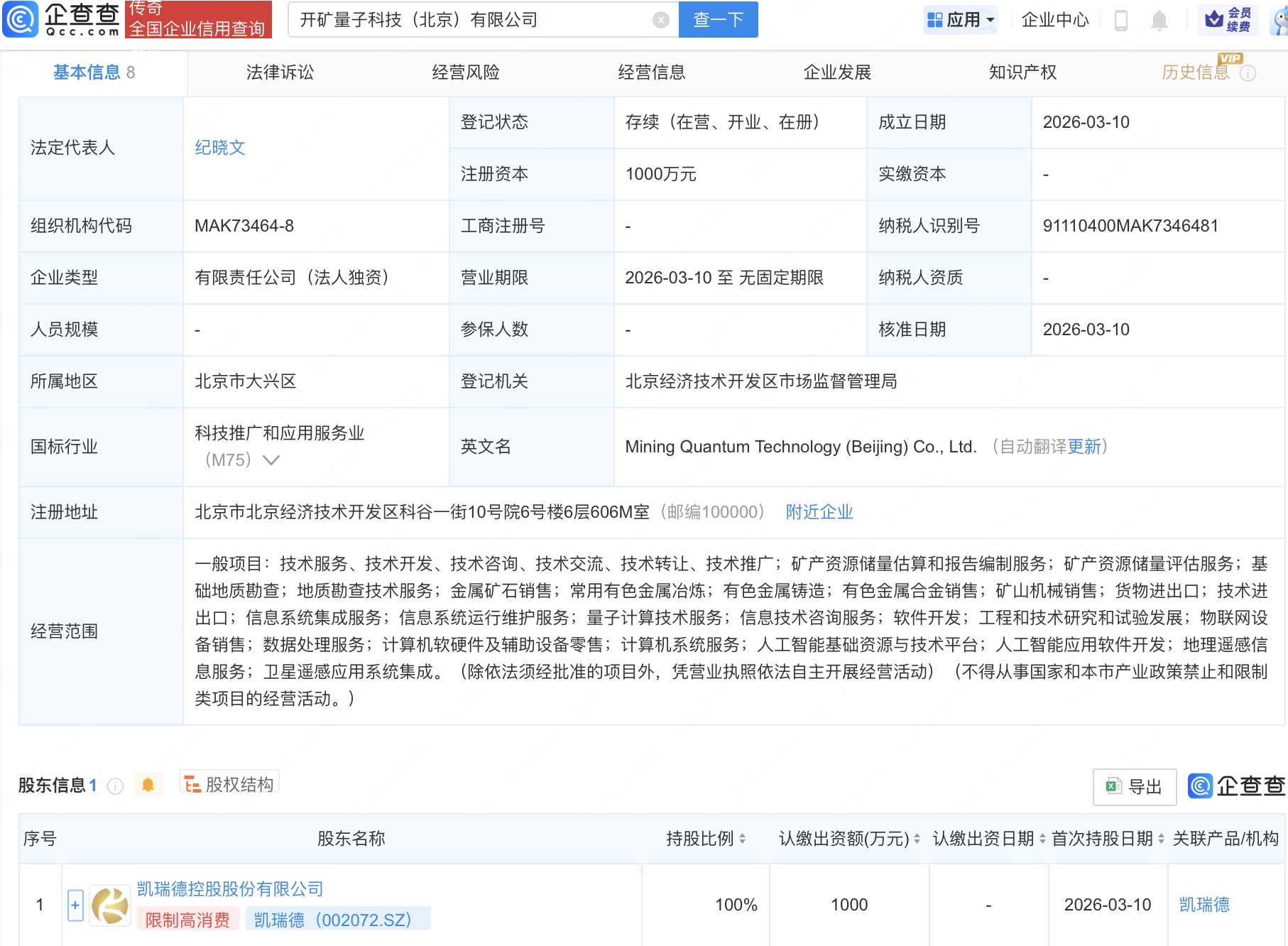 企查查APP显示,近日,开天芯源量子科技(北京)有限公司、开矿量子科技(北京)有限公司成立,经营范围包含:人工智能基础资源与技术平台;人工智能应用软件开发等。企查查股权穿透显示,二者皆由凯瑞德(002072)全资持股。