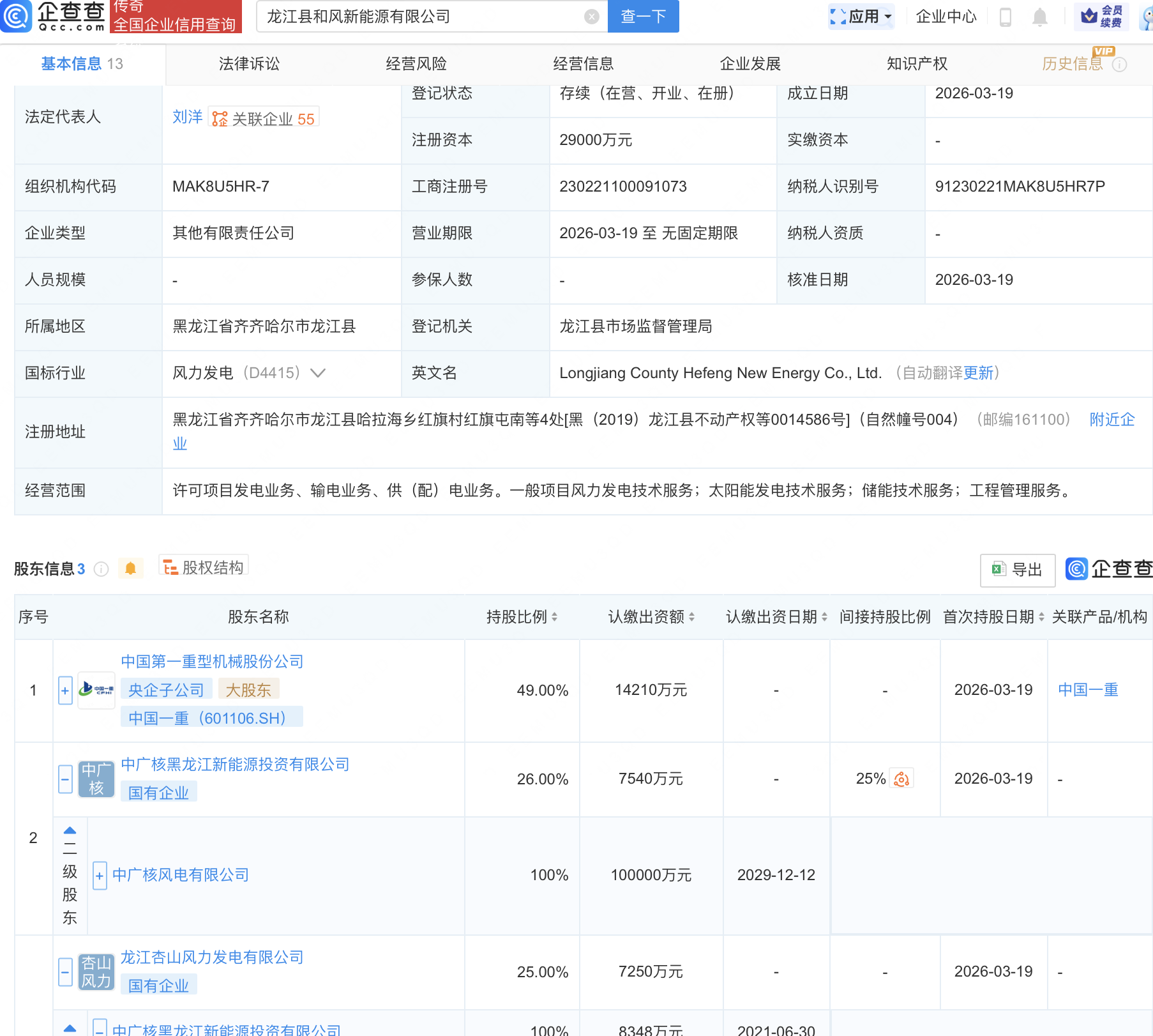 企查查APP显示,近日,依安县盈风新能源有限公司、龙江县和风新能源有限公司成立,注册资本分别为2.3亿元、2.9亿元,经营范围包含均包含:风力发电技术服务;太阳能发电技术服务;储能技术服务等。企查查股权穿透显示,二者皆由中国一重(601106)、中广核风电有限公司全资子公司中广核黑龙江新能源投资有限公司等共同持股。