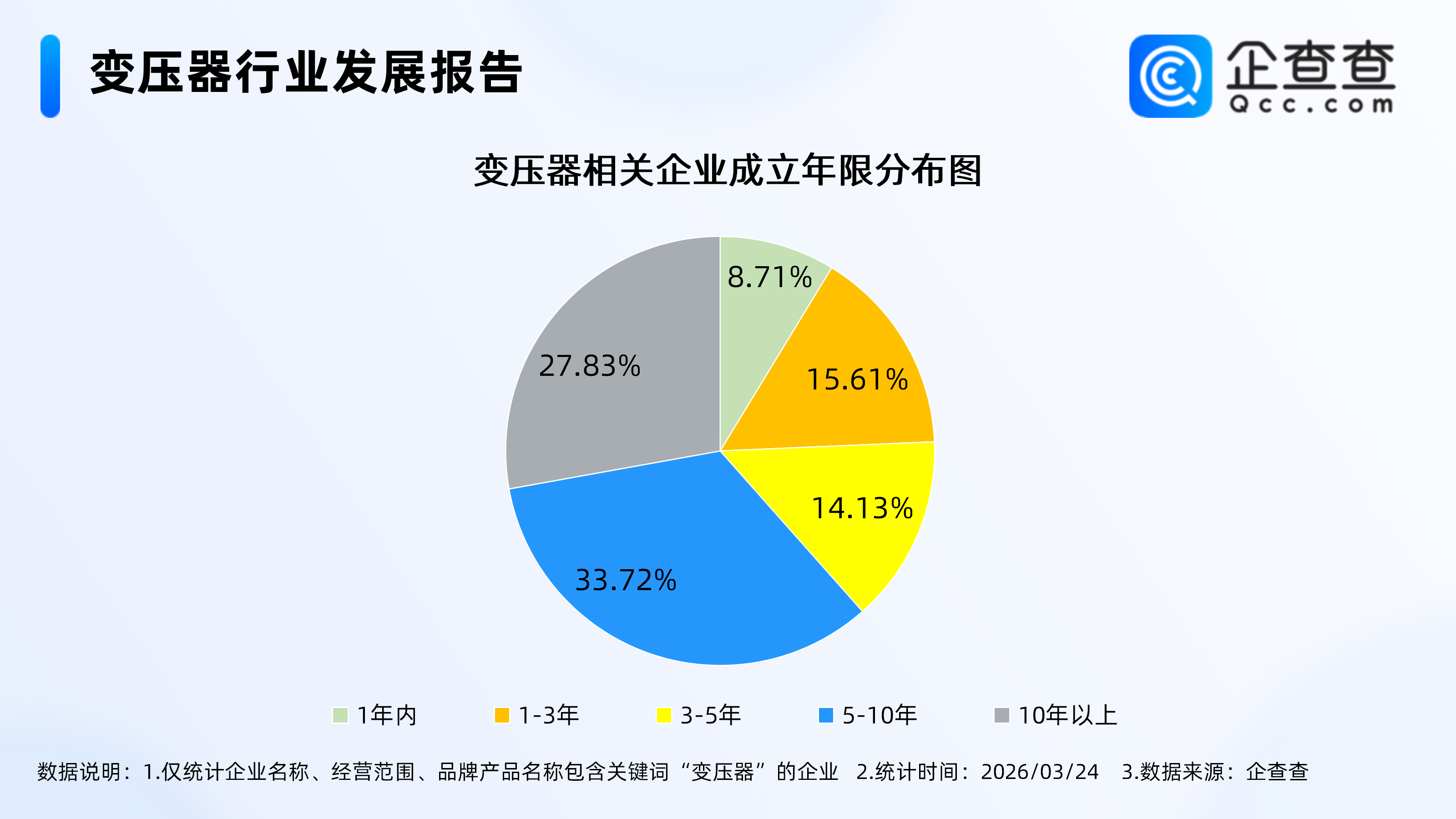企查查数据显示,截至3月24日,国内现存变压器相关企业13.98万家,2025年全年注册1.27万家,同比增长4.81%。截至目前,今年已注册0.24万家。从经营时间来看,现存的变压器相关企业多为老牌企业,成立年限在5年以上的企业合计占比超六成,其中成立5-10年的企业最多,占比33.72%,成立10年以上的相关企业占比27.83%。