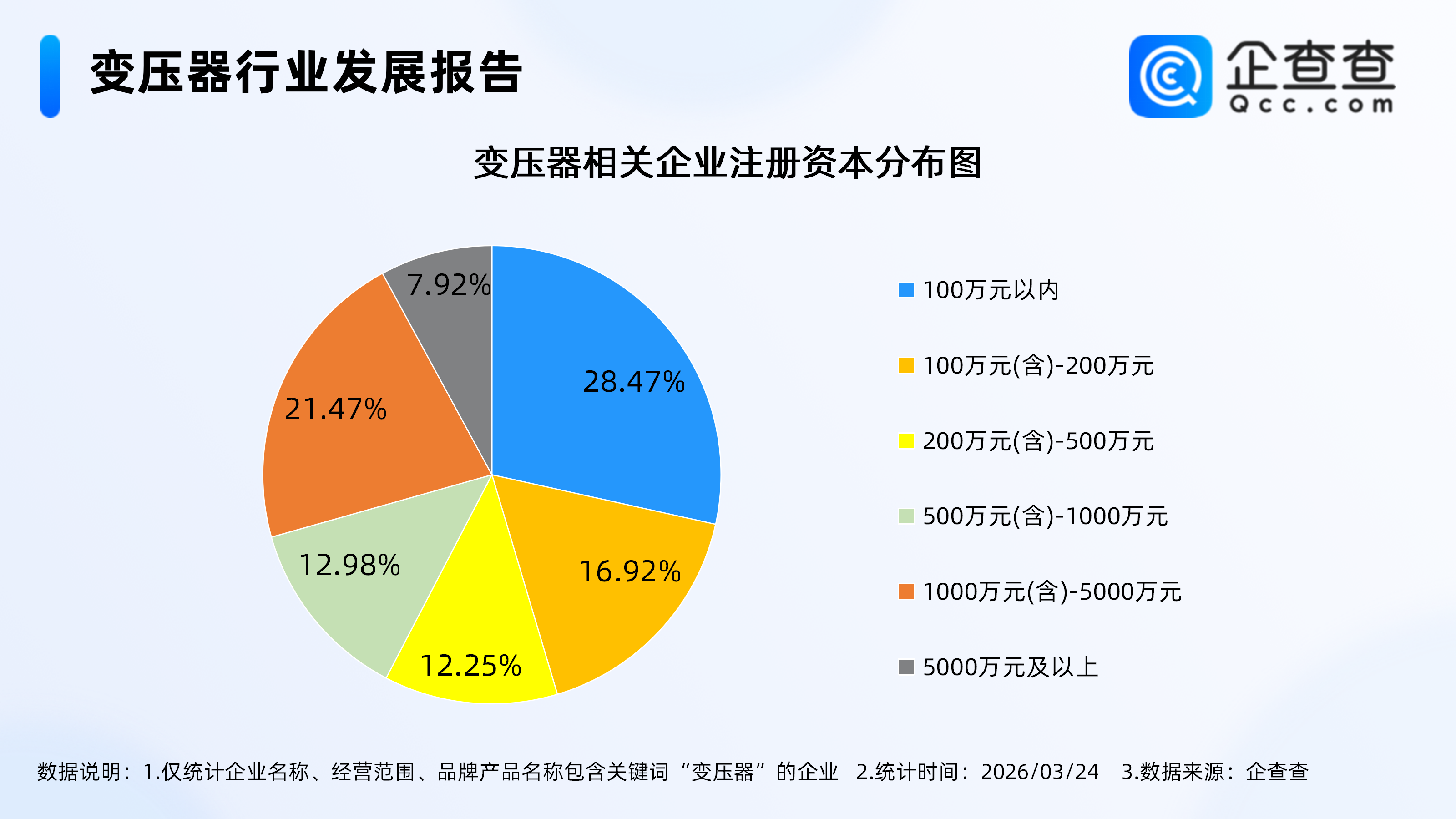 企查查数据显示,从注册资本来看,变压器相关企业注册资本分散层级较为均匀,注册资本在100万元以内占比28.47%,注册资本在1000万元(含)—5000万元企业占比21.47%,注册资本在100万元(含)—200万元企业占比16.92%,形成“中小微企业为基础、中型企业为骨干”的资本结构,既保障市场灵活性,又具备规模化生产能力。