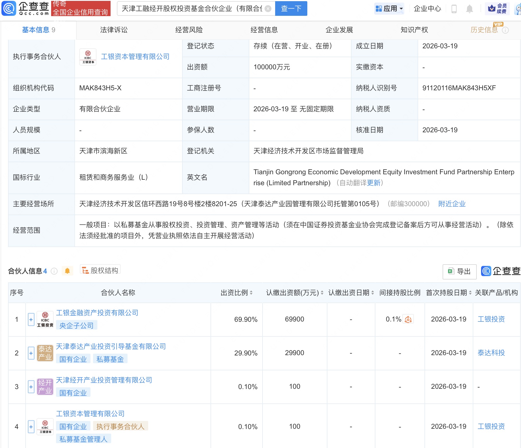 企查查APP显示,近日,天津工融经开股权投资基金合伙企业(有限合伙)成立,出资额10亿人民币,经营范围为以私募基金从事股权投资、投资管理、资产管理等活动。企查查股权穿透显示,该企业由工银金融资产投资有限公司、工银资本管理有限公司等共同出资。
