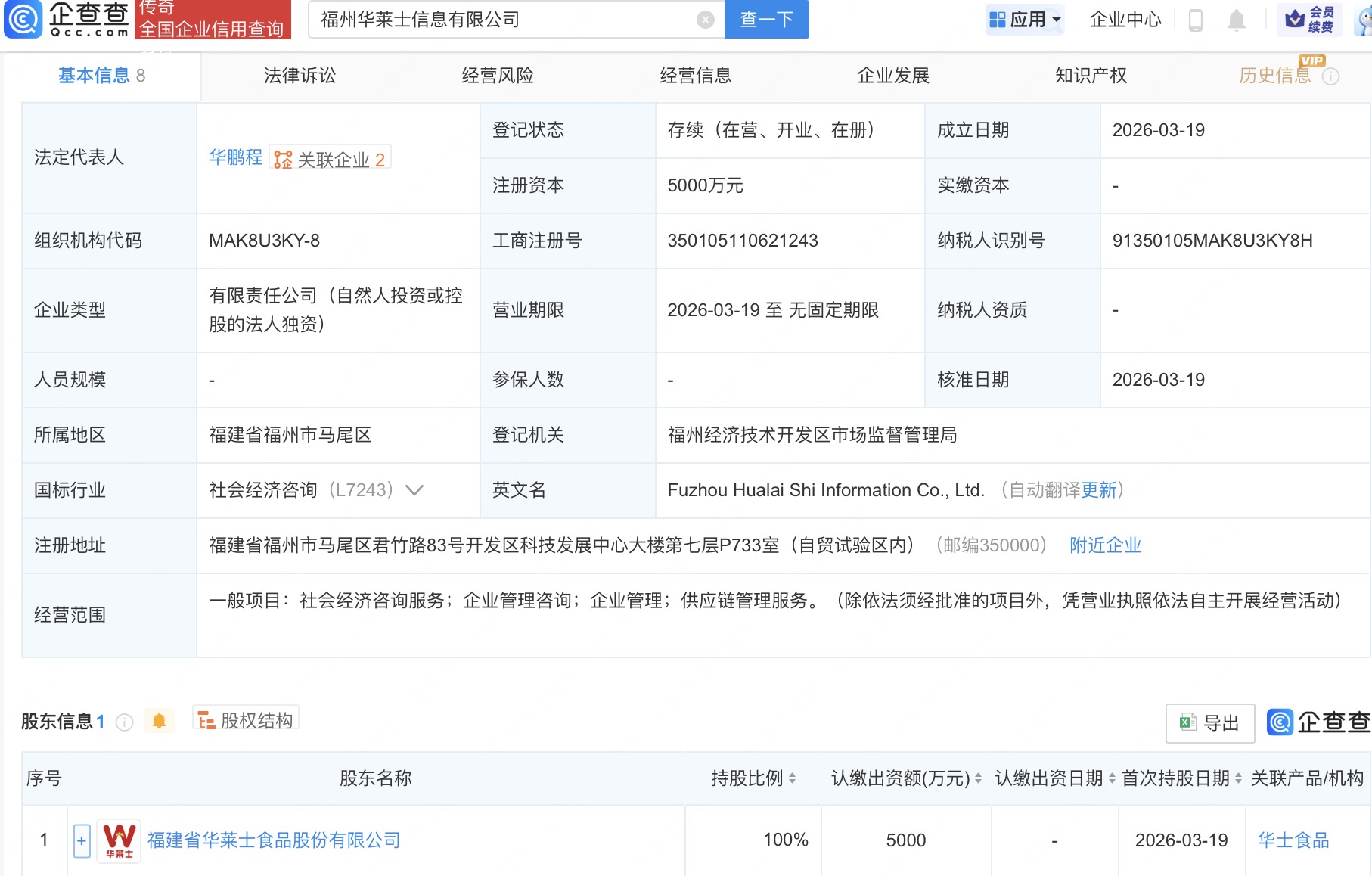企查查APP显示,近日,福州华莱士信息有限公司成立,法定代表人为华鹏程,注册资本5000万人民币,经营范围为社会经济咨询服务、企业管理咨询、企业管理、供应链管理服务。企查查股权穿透显示,该公司由福建省华莱士食品股份有限公司全资持股。