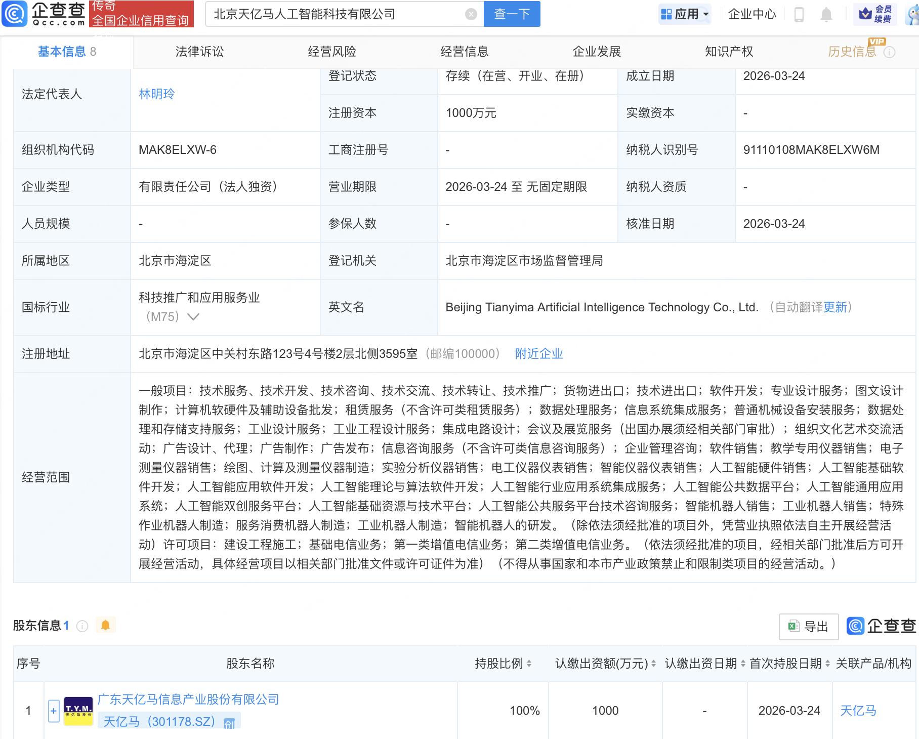 企查查APP显示,近日,北京天亿马人工智能科技有限公司成立,注册资本1000万元,经营范围包含:人工智能硬件销售;人工智能基础软件开发;人工智能应用软件开发;人工智能理论与算法软件开发等。企查查股权穿透显示,该公司由天亿马(301178)全资持股。