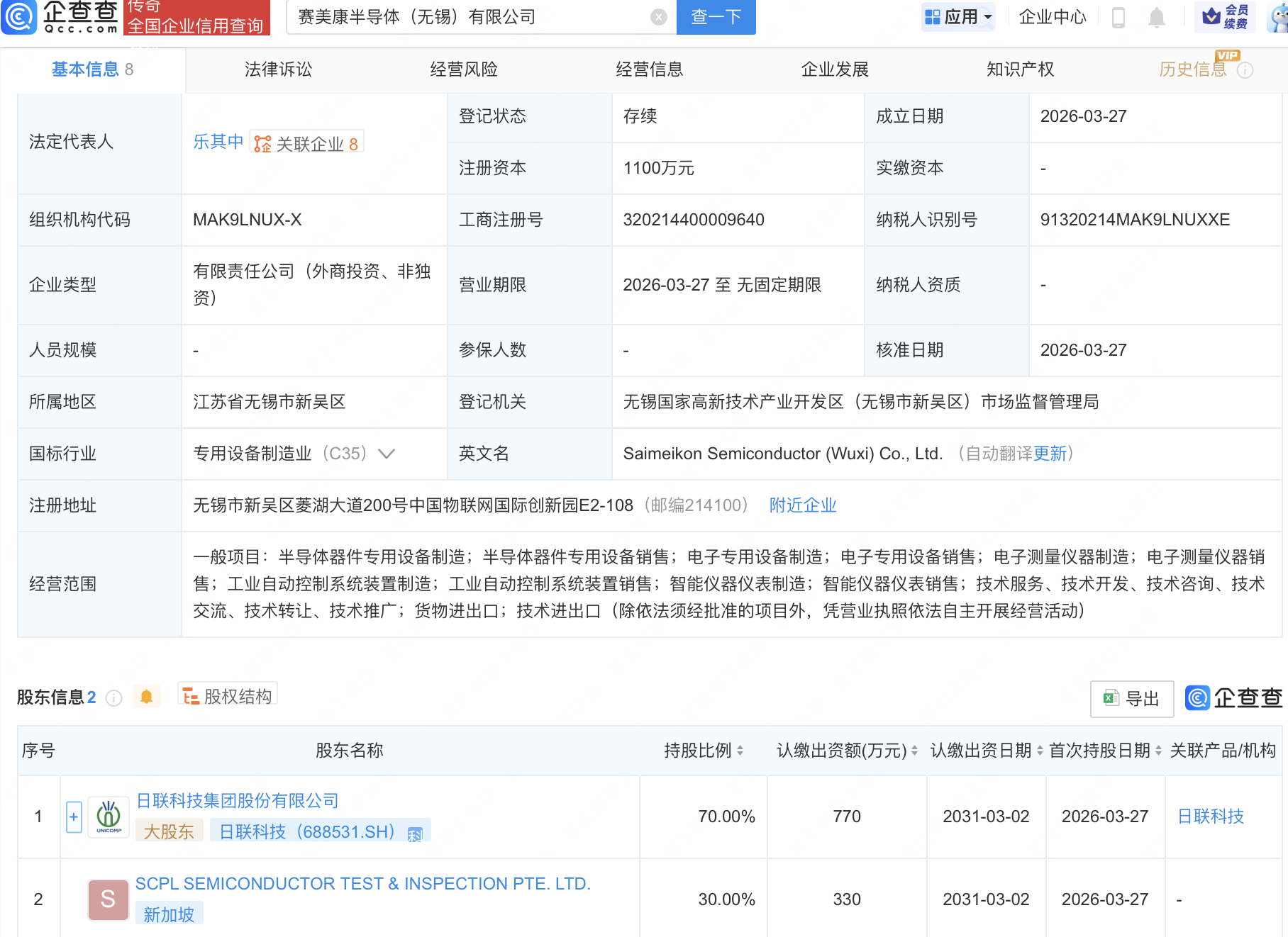 企查查APP显示,近日,赛美康半导体(无锡)有限公司成立,经营范围包含:半导体器件专用设备制造;半导体器件专用设备销售;电子专用设备制造;电子专用设备销售等。企查查股权穿透显示,该公司由日联科技(688531)等共同持股。