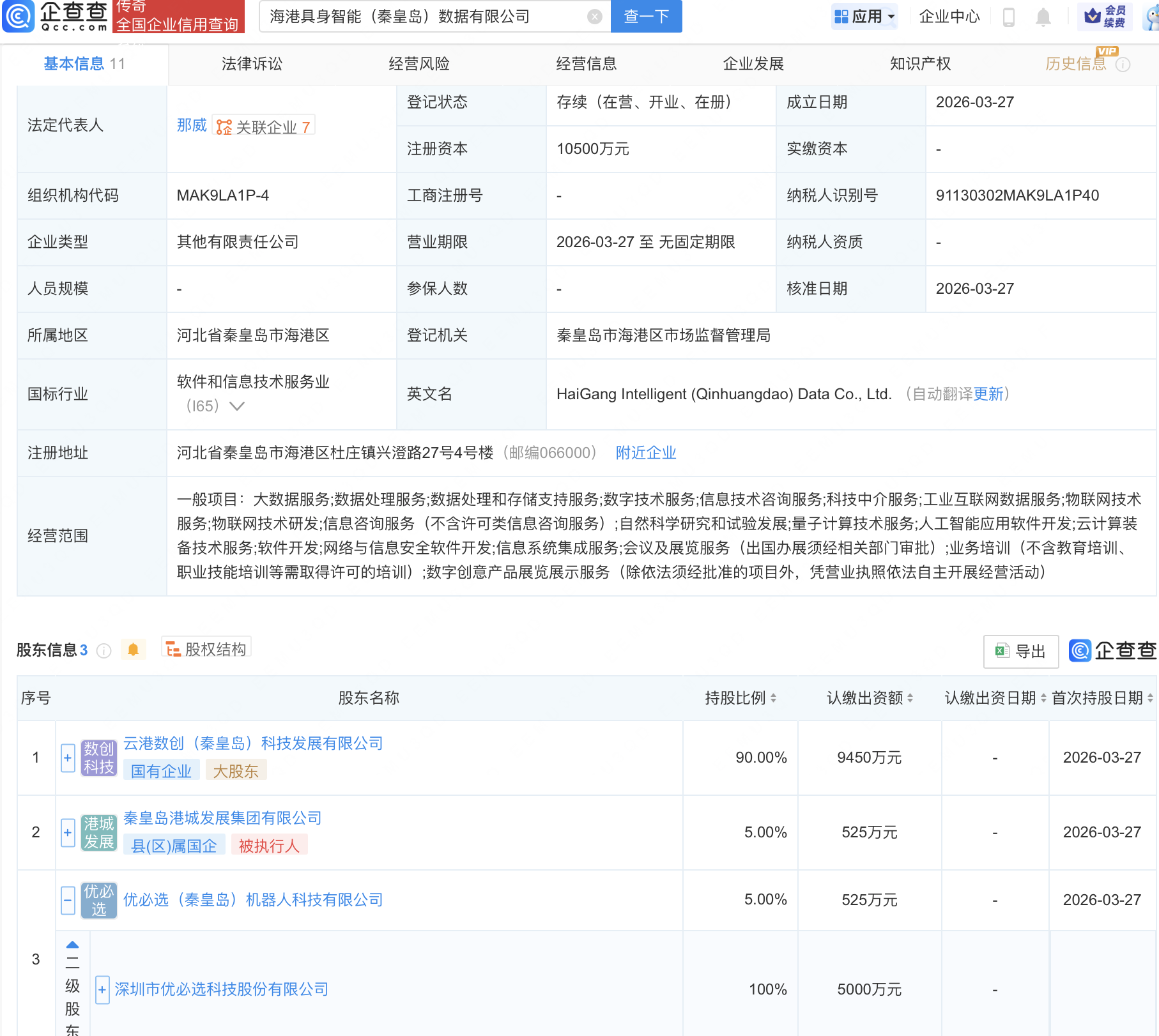 企查查APP显示,近日,海港具身智能(秦皇岛)数据有限公司成立,注册资本1.05亿元,经营范围包含:量子计算技术服务;人工智能应用软件开发;云计算装备技术服务等。企查查股权穿透显示,该公司由优必选(09880.HK)全资子公司优必选(秦皇岛)机器人科技有限公司等共同持股。