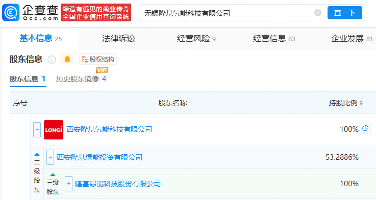 企查查显示,该公司成立于2021年4月,法定代表人为张海濛,经营范围包括特种设备制造、新兴能源技术研发、节能管理服务等,由隆基绿能(601012)旗下西安隆基氢能科技有限公司全资持股。
