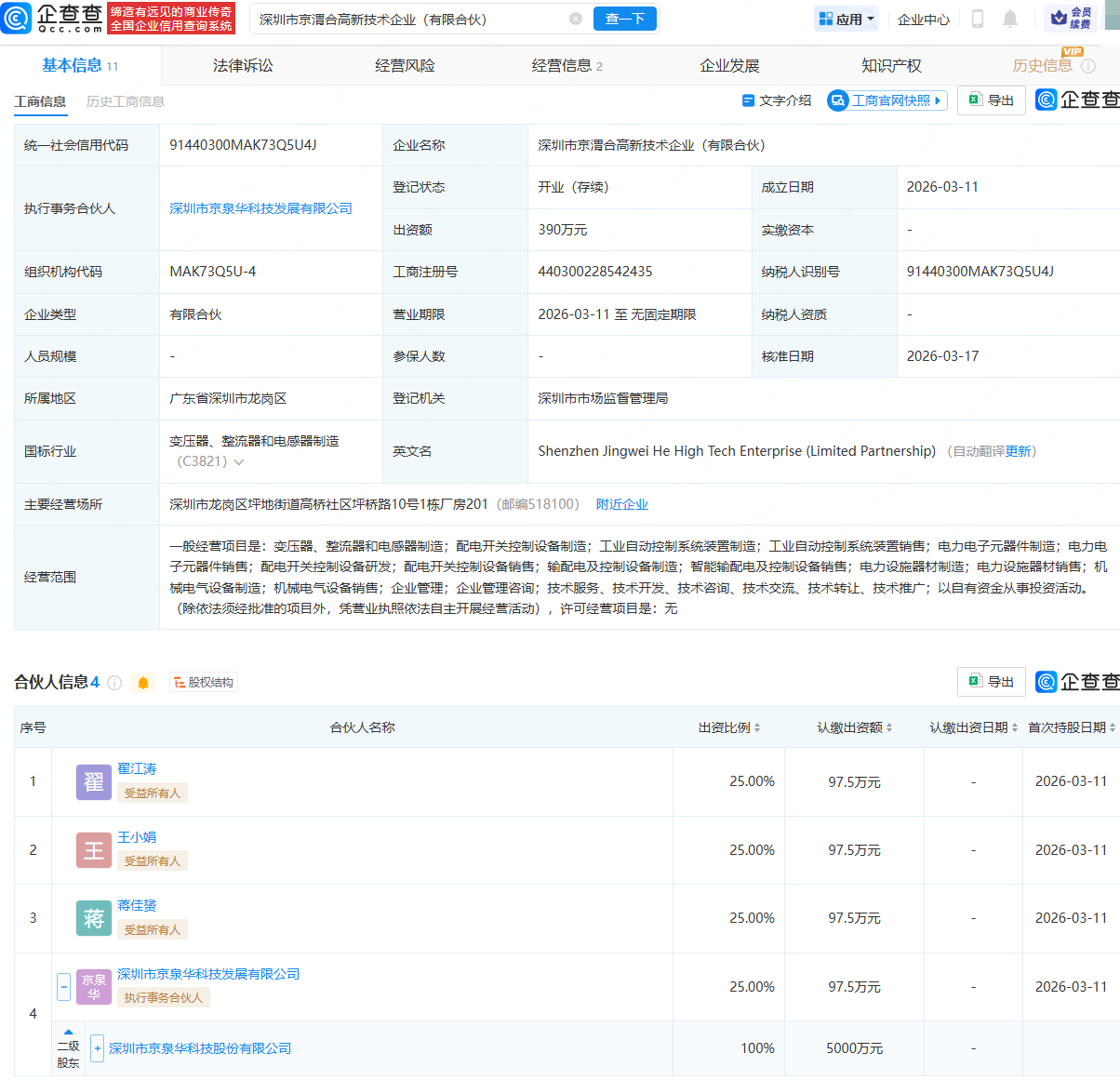 企查查APP显示,近日,深圳市京渭合高新技术企业(有限合伙)成立,经营范围包含:变压器、整流器和电感器制造;配电开关控制设备制造;电力电子元器件制造;电力设施器材制造等。企查查股权穿透显示,该企业由翟江涛、京泉华(002885)全资子公司深圳市京泉华科技发展有限公司等共同持股。