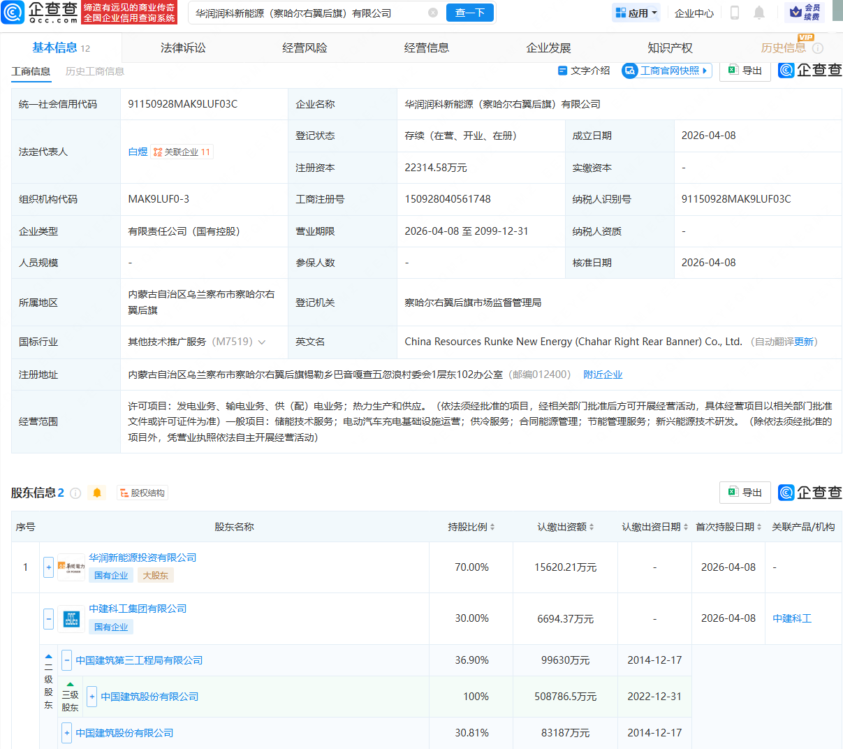 企查查APP显示,近日,华润润科新能源(察哈尔右翼后旗)有限公司成立,法定代表人为白煜,注册资本为2.23亿元,经营范围包含:发电业务、输电业务、供(配)电业务;储能技术服务;电动汽车充电基础设施运营等。企查查股权穿透显示,该公司由华润新能源投资有限公司、中国建筑(601668)旗下中建科工集团有限公司共同持股。