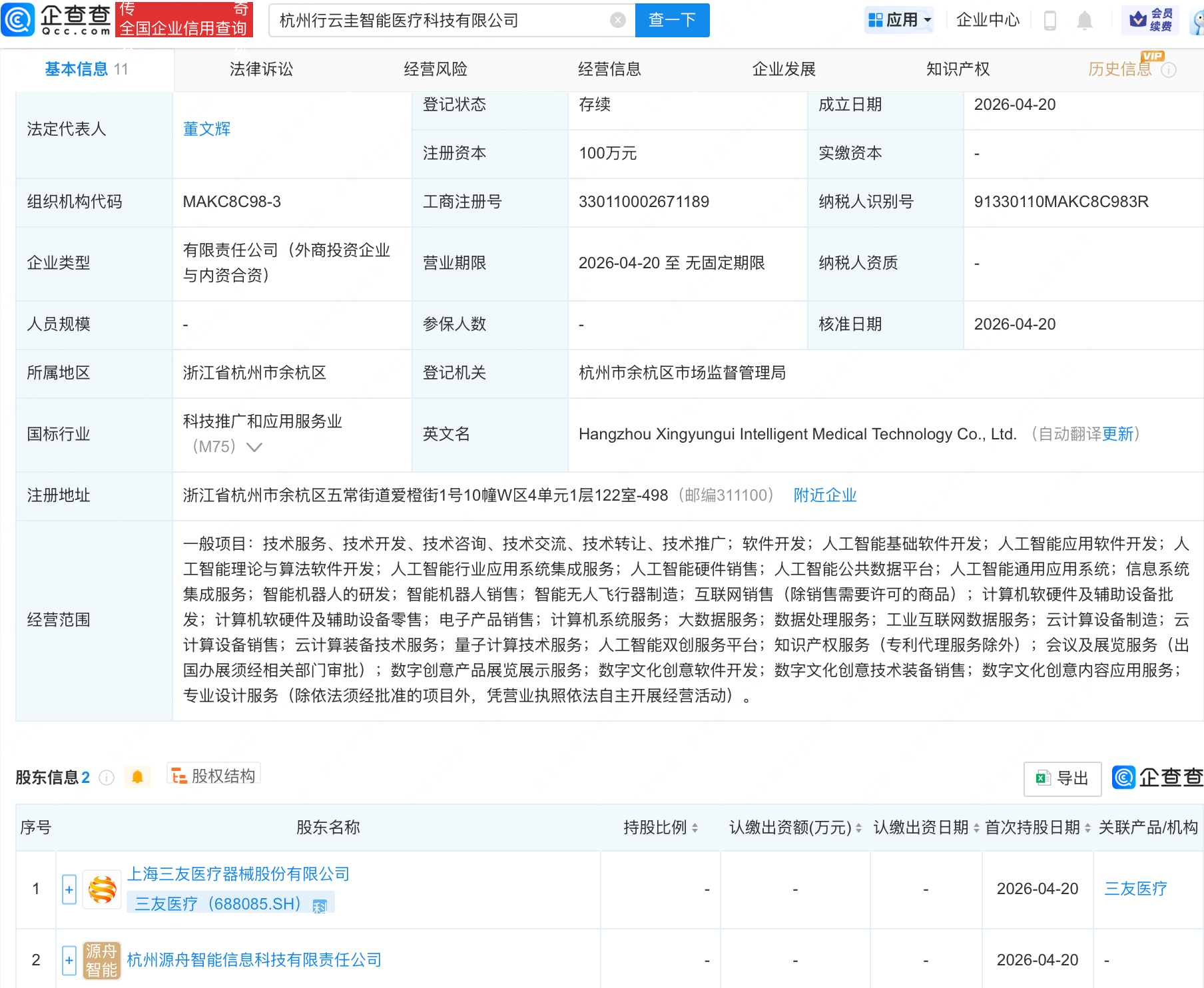 企查查APP显示,近日,杭州行云圭智能医疗科技有限公司成立,经营范围包含:人工智能硬件销售;人工智能公共数据平台;人工智能通用应用系统;智能机器人的研发;智能机器人销售;智能无人飞行器制造等。企查查股权穿透显示,该公司由三友医疗(688085)等共同持股。