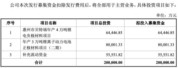 根据公开发行意向书,贝特瑞本次拟发行4000万股,预计募集资金约20亿元,募集资金拟投资于建设惠州市贝特瑞年产4万吨锂电负极材料项目、年产3万吨锂离子动力电池正极材料项目(二期)和补充流动资金。