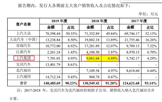 据招股意向书披露,按照合并口径,沪光股份2017年、2018年及2019年前五大客户销售收入合计分别为118,879.50万元、125,488.13万元及130,523.41万元,占当期主营业务收入比例分别为88.86%、87.65%及83.83%。