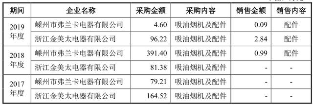 据招股书,2018年至2019年,亿田股份曾向供应商嵊州市弗兰卡电器有限公司(下称”弗兰卡电器”)、浙江金美太电器有限公司销售配件,并且解释称,此举是为了确保产品质量稳定和管理效率的考虑,才将供应商生产所需的配件销售给该等供应商。