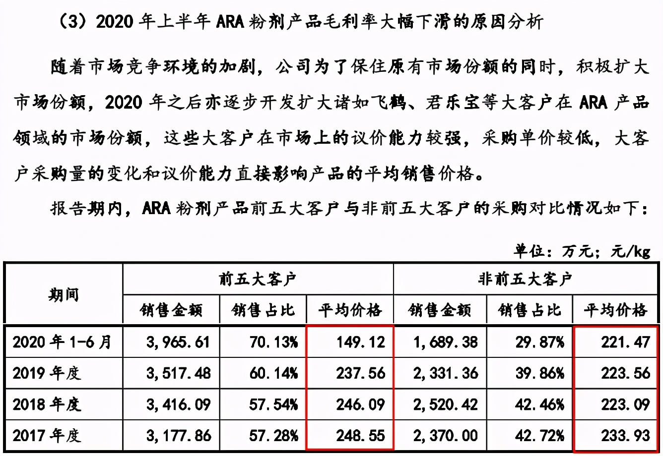 招股书解释,2020年上半年,ARA粉剂产品前五大客户的销售占比达七成,其采购单价低于非前五大客户,是因为飞鹤、君乐宝等大客户的议价能力较强。
