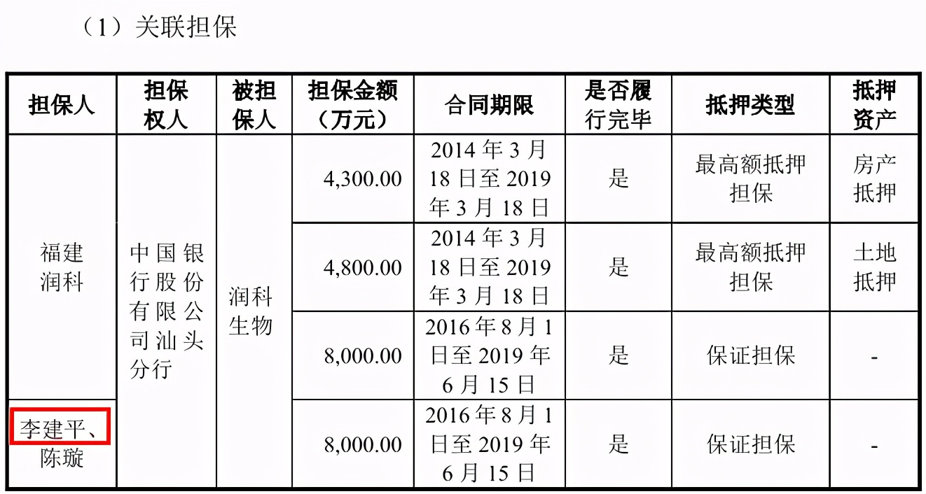 但是在服刑期间,李建平也很忙碌。2016年8月1日至2019年6月15日期间,润科生物向中国银行股份有限公司汕头分行签订了两份借款合同,金额均为8,000万元。两份合同的担保人均包含李建平、陈璇夫妇,贷款抵押类型为保证担保。这中间的2016年8月1日至2017年2月26日还是李建平的服刑期间。