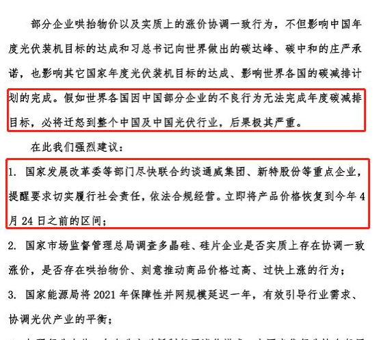 同时,爱旭股份指出通威集团永祥股份觉得多晶硅的价格“月度定价”上涨的太慢,要求改为“周度定价”,使得多晶硅价格月内飙涨37.2%、硅片价格飙涨23.5%,公司已无法安排生产,严重影响行业发展,并希望监管部门出面调控相关商品市场价格。