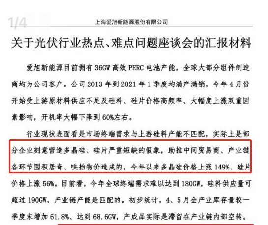 近日,爱旭股份发布一篇名为《关于光伏行业热点、难点问题座谈会的汇报材料》。