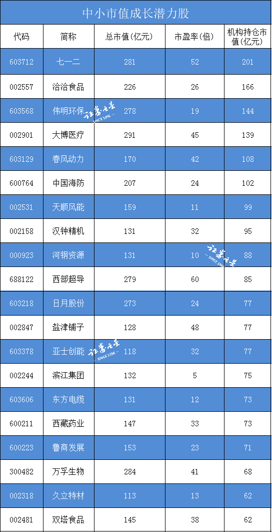 而根据机构持仓的多少,证券之星为大家整理相关中小市值成长股。请看下表: