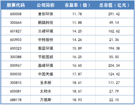 本文对此进行了梳理,筛选出了11支市盈率处于较低水平的相关股票。其中,首创环保、鹏鹞科技市盈率尚不足12倍,三峰环境、中持股份、瀚蓝科技等个股的市盈率已仅在15倍上下。对比行业前景来看,还有不小的发展空间。