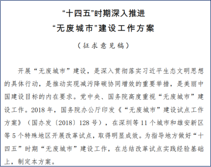 近日,生态环境部发布的《“十四五”时期深入推进“无废城市”建设工作方案(征求意见稿)》提出,将推动100个左右地级及以上城市开展“无废城市”建设。