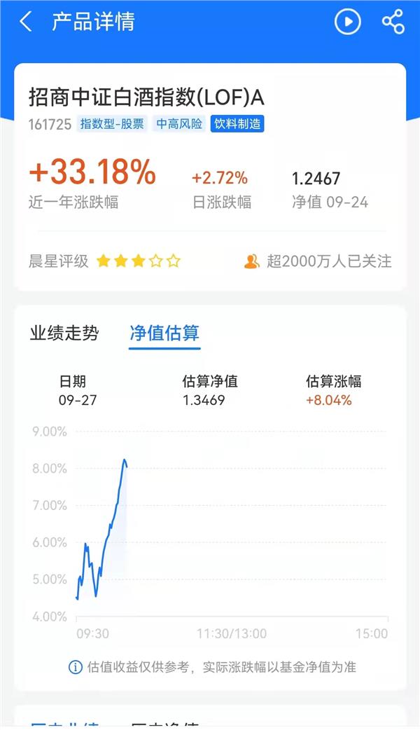 截至发稿,根据基金持仓估值测算,招商中证白酒基金目前净值涨逾8%。